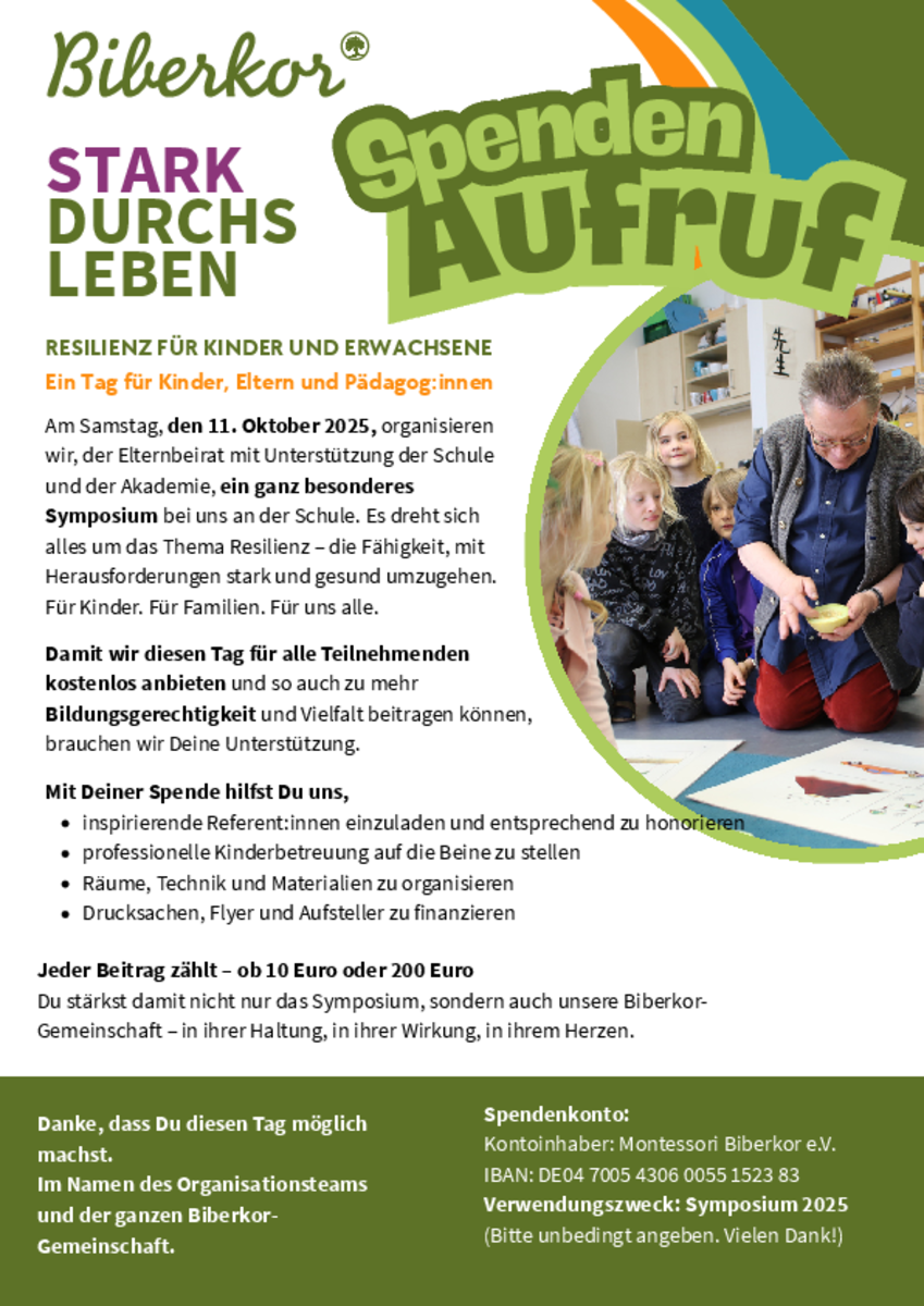 Am 11. Oktober veranstaltet der Elternbeirat mit Unterstützung der Schule und der Akademie erstmalig auf Biberkor ein Symposium mit Expertenvorträgen und Workshops. Damit wir diesen Tag für alle Teilnehmenden kostenlos anbieten können brauchen wir eure Unterstützung durch eine Spende. Jeder Betrag zählt - ob 10 Euro under 200 Euro! Nähere Infos hierzu auf dem Spendenaufruf und zu dem Symposium folgen nähere Einzelheiten im September.